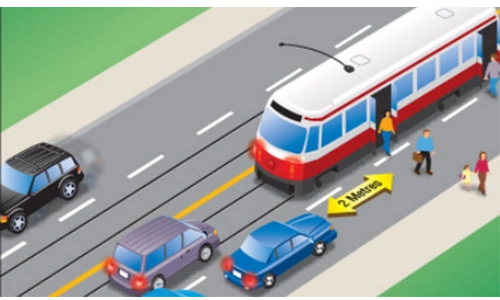 Pass the streetcar on the right, keeping a distance of at least two meters behind the doors where passengers are boarding or alighting.