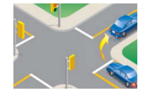 For a left turn, start from the lane closest to the center line and turn into the lane right of the center line. Move to the right curb lane when it is safe.